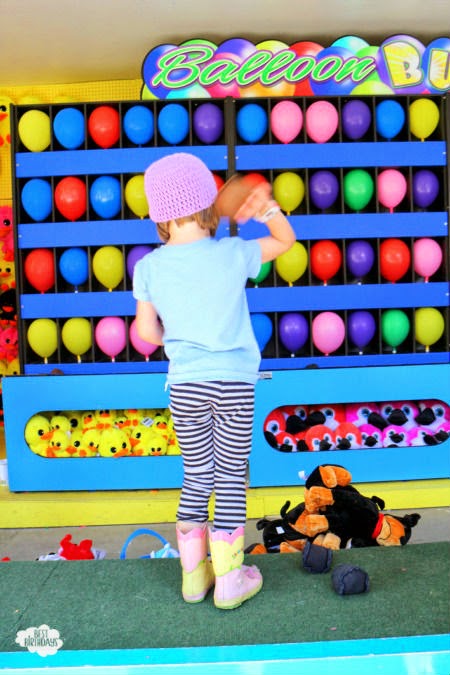 Case in point: we paid for my daughter to have three tries at breaking balloons in this midway game. She started on the ground and instantly threw all of her bean bags. All of them came up short. The staff member handed all of the bean bags back to her, and put her up on the little counter. She tried again, and bang bang! She got a prize.