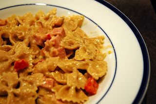 Add ham and cooked (and drained) pasta. Stir until heated through and serve hot.