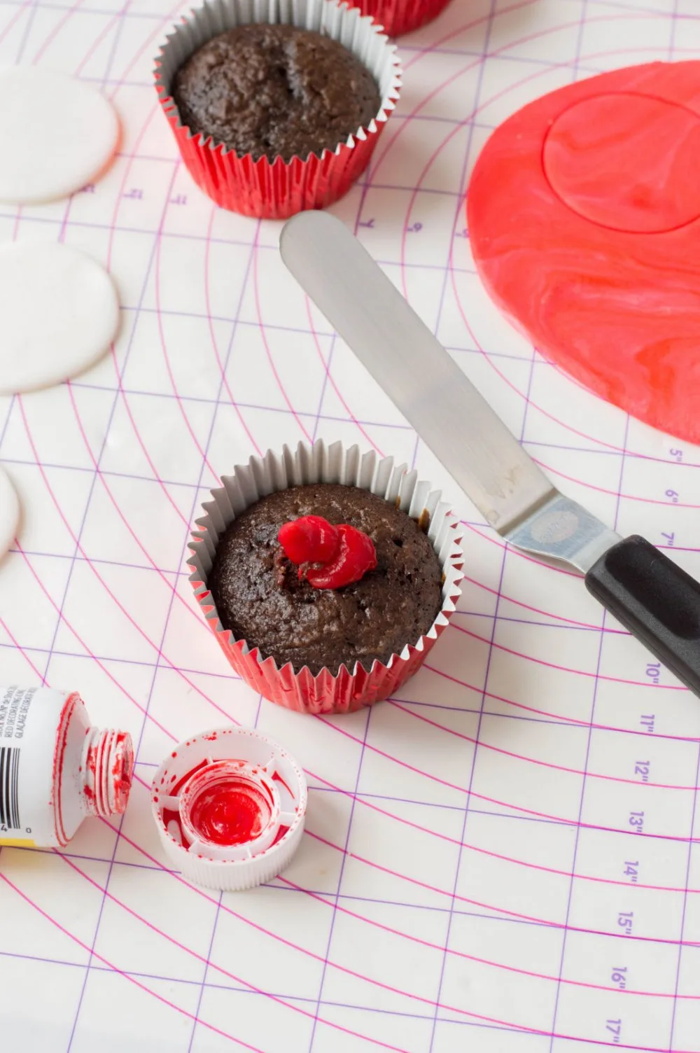 4. Cut each fondant circle in half and place one red and one white half circle on the top of each cupcake.