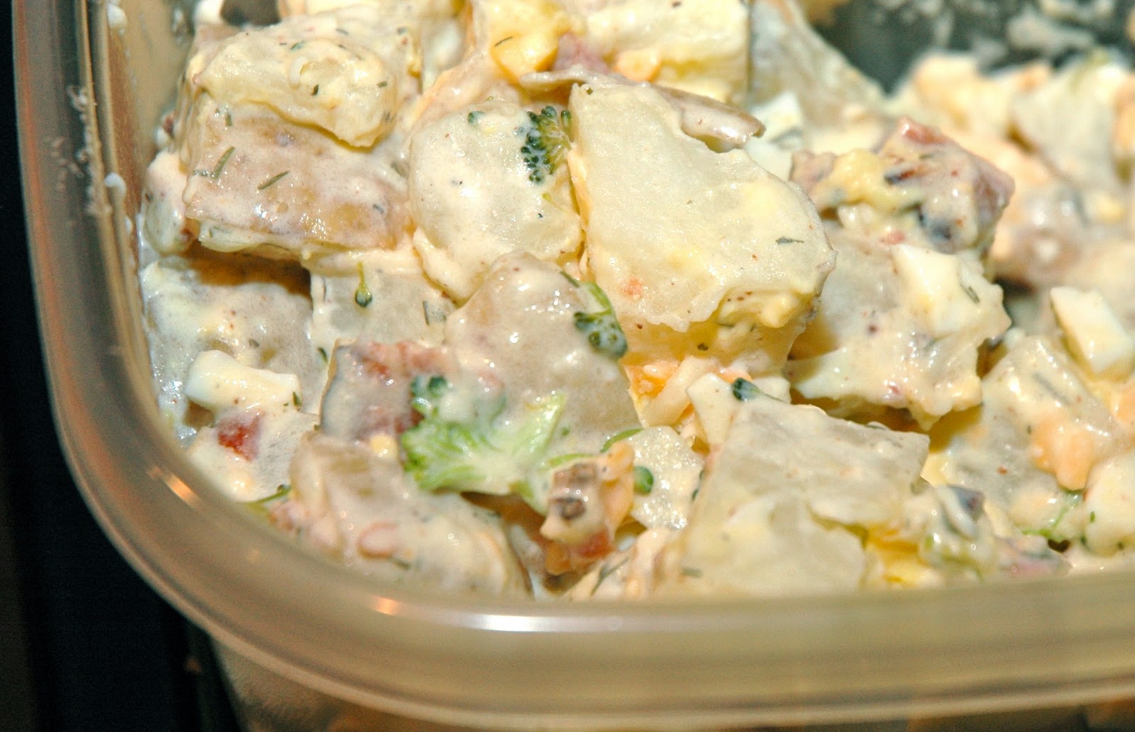 Boil potato cubes until just tender. Cool. Mix all ingredients except bacon and let sit in the refrigerator for an hour or two. Mix in bacon right before serving.